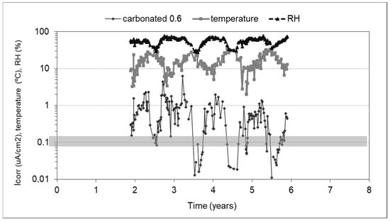 In Figure 2 is shown an example of the temporal variation of a carbonated specimen exposed outdoors, not protected from rain effects. The variation of temperature together with the rain periods induce the changes in the detected RH values in a hole inside the concrete and, consequently, the corrosion rate (Icorr) changes [].