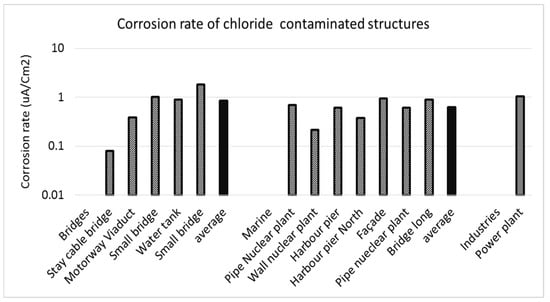 Average values of corrosion rate in different structures contaminated by chlorides.
