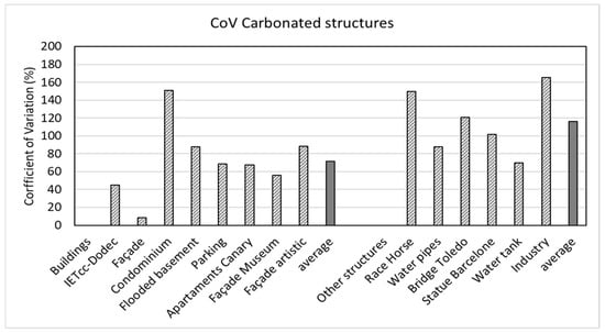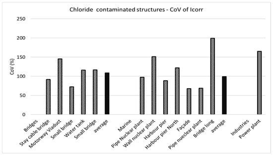 The results given here correspond not to a single structure, but to different ones for the illustration of the ranges of corrosion that can be found in real cases, in spite of having apparently similar exposure aggressivity. The reasons are the different concrete qualities and cover depths in each structure and element. In Figure 3 are the average corrosion rate values measured in structures contaminated by chlorides (either due to deicing salts, bridges, or by marine environments), and in Figure 4, their coefficient of variation (CoV) in each structure (for appraising the spatial variation at the structure level) is shown. Figure 5 shows the corrosion rate values measured in carbonated structures and Figure 6 shows their CoV.