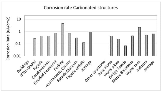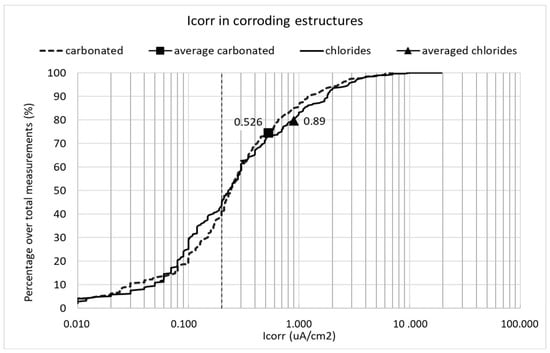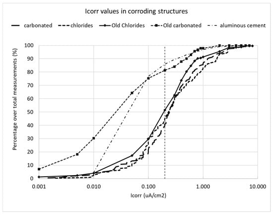 Statistical representation for the values of corrosion rate measured in all kinds of structures (“Old” and “aluminous cement” refer to measurements made by the company Geocisa) [].