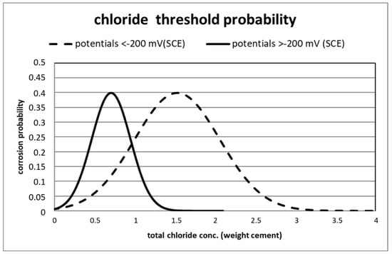 - Another distribution with a higher averaged value was also found by [] for potentials more cathodic than −200 mVSCE, which could represent wet/submerged structures, and that gives as corrosion threshold an averaged value of 1.53% by weight of cement. The range of possible threshold values is higher until around 3%;