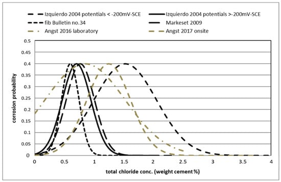 Some statistical distributions of the chloride threshold [,,,,] showing the variability of the distributions, that however are of them within the limits shown in Figure 7.