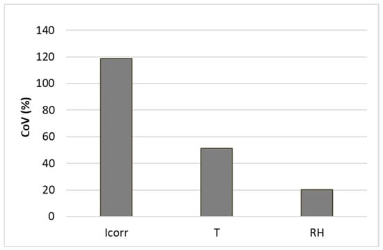 In real structures, a “temporal”variation of the corrosion rate due to the climatic conditions evolution was found []. Thus, in the same structure, the corrosion parameters (potential, resistivity and corrosion rate) evolve following the temperature/humidity variations along the year. To derive the relation of the instantaneous corrosion rate with the climatic events is not straight forward, as with the same Relative Humidity (RH) and temperature (T), very different corrosion rates can be obtained depending on the previous history of climatic events or the exposition to the rain []. A general law relating instantaneous corrosion rate and RH and T still has not been formulated. In the present case, a new approach is explored on the possibility of characterization the variations in function of the environmental changes. Thus, taking the period of 4 years shown in Figure 2, Figure 9 shows the CoV of these variables during this period. The variation of the corrosion rate is the larger one due to it changes with logarithmic shifts. It can be derived from a simple relation that in the present results gives: