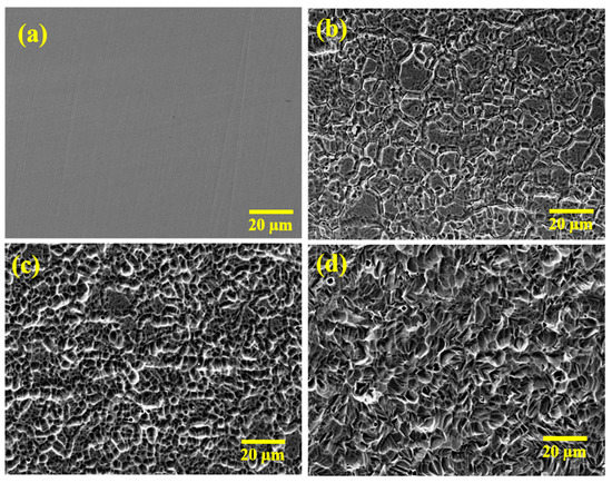 SEM images of untreated and treated 316L SS specimens (a) Bare, (b) EP2.5V, (c) EP5.0V, and (d) EP7.5V.