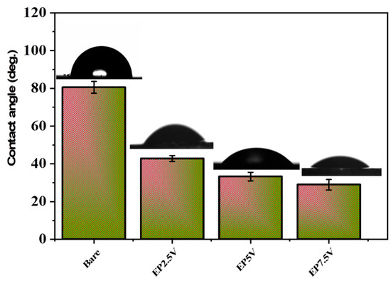 Assessing the surface hydrophilicity characteristics is considered the critical elucidation to describe the appropriateness of the material’s surfaces for interrelating with another material [17]. Improvement of the surface chemistry at an interface can effectively modify performance by enhancing interfacial interactions and compatibility with a subsequent polymeric molecule. Frequently, these characteristics can be obtained by tailoring the degree of surface hydrophilicity at an interface. The impact of applied voltage on the surface hydrophilicity of the SS specimens was inspected by monitoring the WCA, and the results are presented in Figure 3. WCA of the bare specimen was found to be 80.50°, revealing a lower surface wettability of the bare SS. The WCA of the SS specimen after electrochemical passivation was sharply decreased to 42.75° (EP2.5V), 33.26° (EP5.0V), and 26.35° (EP7.5V). This validates the improved surface wettability due to the homogeneous surface profile with high surface profile and roughness. Szczepanski et al. [18] emphasized the importance of surface hydrophilicity during the polymer interaction at the interface and reported that the surface hydrophilicity is a critical and necessary design parameter in the field of functional coating materials. The accomplished surface wettability of the SS specimen is anticipated to facilitate improved interaction with the polymeric chain in the subsequent coating process.