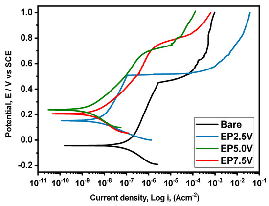 Primarily, to select the optimized passivated surface for the subsequent coating’s deposition, the corrosion resistance of all the passivated specimens was evaluated in a 3.5% NaCl solution using the PDP tests. The obtained PDP curves are given in Figure 4. The bare specimen presented the highest corrosion current density (icorr) (5.471 × 10−5 A cm−2) and lowest corrosion potential (Ecorr) (−0.0358 V) values among the examined specimens.