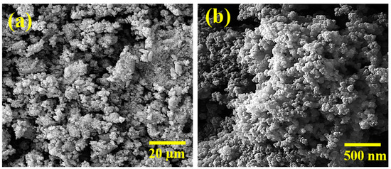 SEM images of synthesized PPy nanoparticles (a,b) in different magnification.