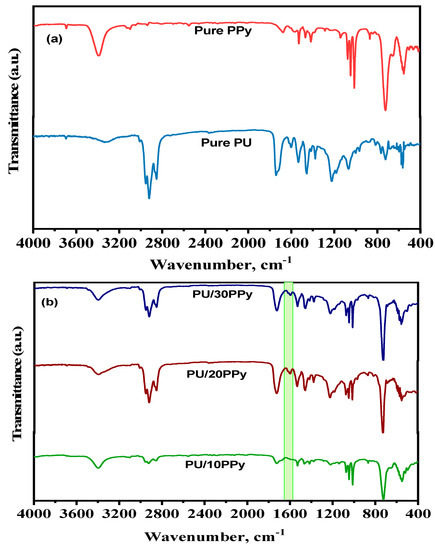 IR curves of prepared (a) pure PU, Pure PPy and (b) its composite coatings.