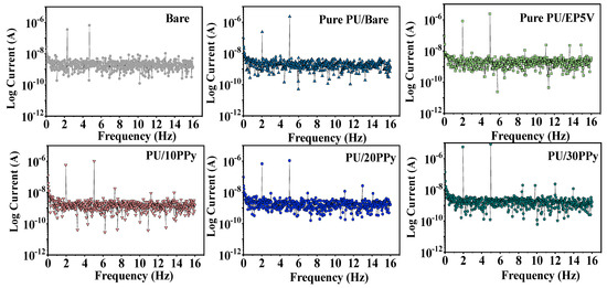 Figure 8 presents the EFM curves of uncoated and coated SS specimens in NaCl, and the estimated parameters are presented in Table 3. The experimentally obtained values were authenticated by comparing the theoretical causality factors, such as CF-2 and CF-3 [24,25]. EFM provides many advantages, including zero sample degradation, greater speed, and the novel capability to intrinsically authenticate the precision of the obtained data by monitoring the parameters such as CF-2 and CF-3. In this investigation, CF-2 and CF-3 values were almost the same as the theoretical values of 2.0 and 3.0, further validating the experimentally acquired values. Compared to the bare specimen, the pure PU and PU/PPy composite coatings showed the Ecorr values of about 100 mV and 150 mV, and the icorr reduced from 0.5471 μA cm−2 to 0.0284 μA cm−2 and 0.0145 μAcm−2, respectively. The notable reduction in icorr and the optimistic change in Ecorr values for the coated specimens corroborate that the prepared composite coatings on passivated specimens provide enhanced corrosion protection in the NaCl medium.