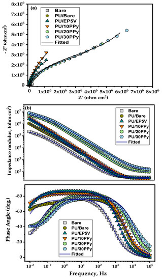 However, the coated SS specimens displayed two time constants: the one at high frequencies associated with the barrier features of the polymeric films and the other relating to the charge transfer reactions at the SS surface under the PU film [26]. Predominant capacitive characteristics were observed for all the examined coated specimens at the investigated frequencies. Furthermore, the impedance value at the low-frequency region was observed to be near 106 Ω cm2, indicating high corrosion resistance due to the strong barrier characteristics of the PU coatings [27]. In particular, the PU/30PPy coated specimens showed a noteworthy rise in the impedance at lower frequencies, most likely due to the construction of compact and defect-free coating films compared with the pure PU coating.