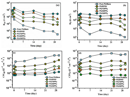 Furthermore, equivalent circuit fitting analyses were performed to quantitatively estimate the achieved EIS curves, and the utilized EIS models are shown in Figure 10. Rct, Rf, and Rs designate the charge transfer, film, and electrolytic resistances, respectively. Constant phase element CPEdl (electric double layer capacitance) and CPEf (coating capacitance) were selected to replace capacitance, owing to the surface heterogeneity from ideal capacitance [29,30]. The obtained values for the bare and coated SS specimens are presented in Table 4. Figure 11 displays the obtained EIS parameters as a function of the immersion time. For PU/PPy coatings on passivated specimens, Rct values are higher than the pure PU coatings on bare specimens. The impedance value of the PU/bare SS specimen was significantly decreased after the immersion of 30 days. This result confirmed the beneficial role of both passivated surface and PPy inclusion on the PU coatings.