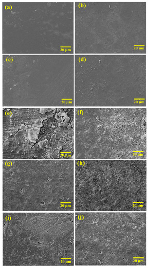 SEM images of prepared coatings (a) PU/EP5V, (b) PU/10PPy, (c) PU/20PPy, (d) PU/30PPy, and (e) bare, (f) PU/Bare, (g) PPy/EP5V, (h) PU/10PPy, (i) PU/20PPy, (j) PU/30PPy after immersion in 3.5% NaCl solution.