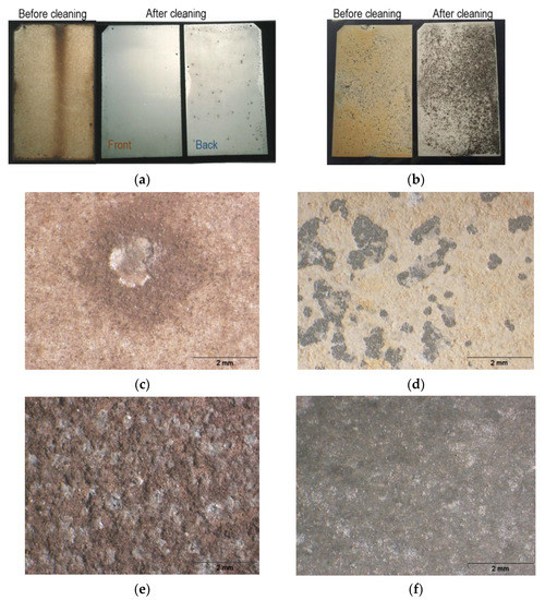 Test specimens exposed at Barreiro (on the left) and at Rodão (on the right): (a,b) visual aspects before and after cleaning (Steps I and II); (c,d) OM images of the anodized aluminum front surfaces after 10 years’ exposure and (e,f) OM images of the bare aluminum specimens’ front surfaces after the same time of exposure.