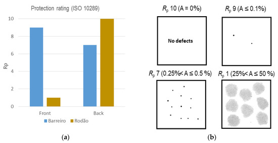 Evaluation of anodic coating protection performances after 10 years’ exposure at both test sites: (a) average (considering all thickness ranges) protection ratings, Rp; (b) correspondent standard corrosion-affected areas and dot charts used (scale: 1:2).