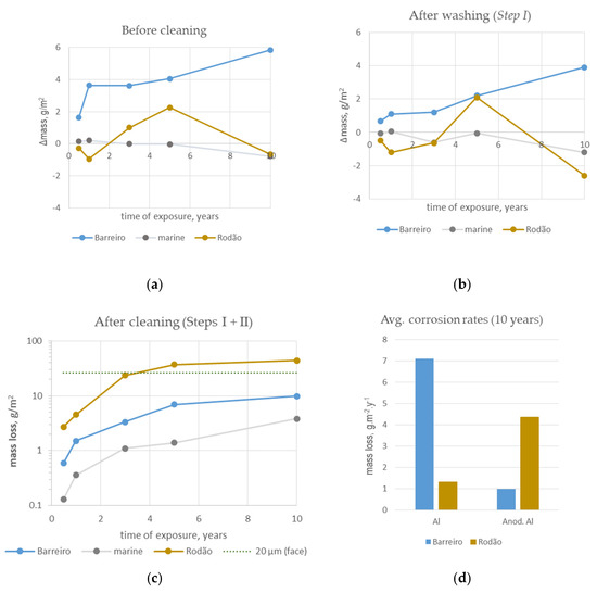Mass variations with exposure: mass changes after (a) exposure, before cleaning and after (b) washing (Step I cleaning procedure); (c) mass loss after washing and cleaning in nitric acid (Steps I + II cleaning procedure); (d) comparison of anodized aluminum and bare aluminum corrosion rates calculated based on the mass losses obtained after ten years of exposure.