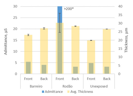 The measurement of the admittance of the anodic layer was carried out on one of the 10-year-exposed specimens from both test sites and on an unexposed specimen (for comparison). The results obtained are presented in Figure 7. Both the anodic coating admittance (Y) and thickness values measured were plotted instead of only the corrected admittance value for a standard 20 µm coating. This is because the anodic coating thickness measurements obtained for the Rodão test specimens’ upward (front) surfaces were not reliable. The tested areas were previously washed with water to remove loose deposits, and this test was carried out in areas without corrosion pits for the test specimen from Barreiro. The admittance measurements were taken at a controlled room temperature (21 °C). It should be noted that the admittance of proper hydrothermally sealed anodic coatings should not exceed 20 µS or 25 μS [34] relative to the conventional coating thickness of 20 μm for clear (uncolored) coatings, which was the case for the samples in this study.