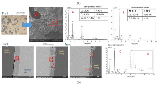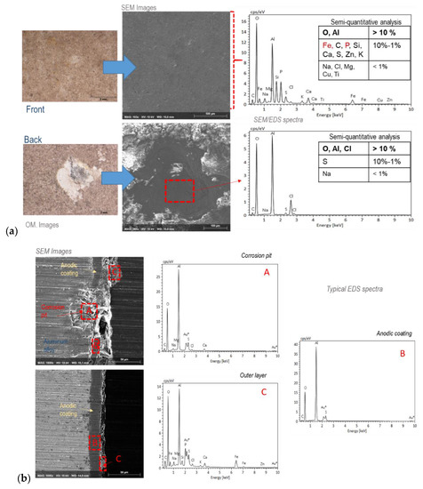 (a) Surface and (b) cross-sectional morphologies and analyses of the anodized aluminum test specimens exposed at the Rodão test site after 10 years’ exposure. The OM and SEM images were obtained in zones with (front) and without (back) visible degradation of the anodic coatings; the EDS spectra and respective semi-quantitative analysis results shown are relative to the signaled zones in the SEM images.