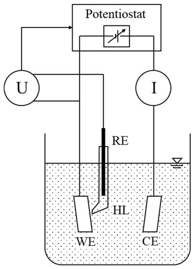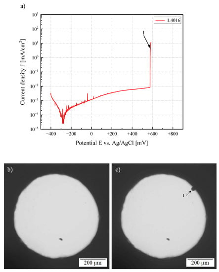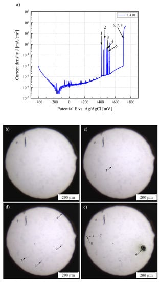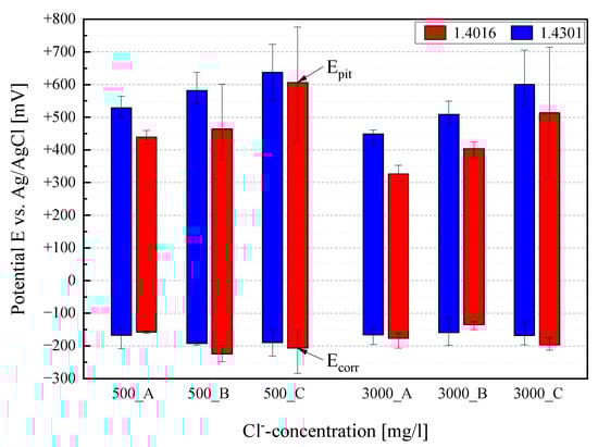 - Kiremit, S.; Stallmeier, Y.; Klöcker, M.; Kordisch, T. Analysis of the corrosion behavior of stainless steel in aqueous electrolyte with different compositions. In Proceedings of the Tagung Werkstoffprüfung 2020, Online, 3–4 December 2020. [Google Scholar]