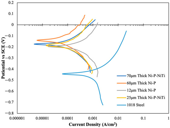 Pure corrosion, pure erosion, and erosion–corrosion tests were conducted on Ni-P and Ni-P-NiTi of various thicknesses in a slurry pot erosion–corrosion (SPEC) tester. Their results were compared to the AISI 1018 steel substrate. Figure 1 shows a schematic of an SPEC unit. A 4 L glass vessel held the samples and the slurry that was impelled by a motor-driven impeller. The impeller speed was 900 RPM and the slurry temperature was 45 °C for all the tests. It is important to note that slurry pot erosion corrosion tests were conducted at 45 °C to simulate the oil sand processing operation (i.e., hydro-transport, separation, etc.) where the temperature ranges from 40 to 50 °C. The slurry had a mixture of 3.5 wt% sodium chloride (NaCl) as a corrosive medium and 35 wt% AFS 50–70 silica sand for the erosion. Deionized water was used to prepare the test slurries. The samples were mounted in epoxy so that only the test surface was exposed. Each coating type had three samples used for this experiment. One sample was for pure erosion (E0), one for erosion–corrosion (EC), and the other one was used for pure corrosion and erosion-enhanced corrosion. A three-electrode cell with a Gamry PC4/750 potentiostat to allow for an electrochemical assessment and cathodic protection control. In this study, the linear polarization technique is used for pure corrosion and potentiodynamic polarization is used for the erosion-enhanced corrosion measurement. During the linear polarization resistance tests for pure corrosion, a potential 30 mV more negative than the corrosion potential was applied at a sweep rate of 0.6 V/h, while the erosion-enhanced corrosion potentiodynamic polarization tests were conducted at a potential 250 mV below and above the corrosion potential (Ecorr). Electrochemical tests were conducted in situ vs. the saturated calomel electrode (SCE) and Pt counter electrode. Linear polarization is a non-destructive way of estimating the instantaneous corrosion rate of a metal, and its use for the pure corrosion test preserves the material’s surface so that the erosion-enhanced corrosion test can be performed on the same sample. While potentiodynamic polarization is typically considered to be a destructive technique, it yields a more precise corrosion current and therefore is preferred for the erosion-enhanced corrosion test since the destructive nature is not a factor. Both linear polarization resistance and potentiodynamic polarization were performed twice and the results presented are the average corrosion rate from these two measurements.