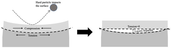 Typically, residual stress induced during plating in the coating is tensile near the substrate and transitions into compressive stress as the thickness increases [22,23]. The initial residual stresses in the material have an effect on the consequential stresses induced by shot peening [36,37]. During erosion, which is effectively equivalent to shot peening, this thick coating surface undergoes a further compression [38,39]. However, in shot peening, the tensile stresses develop at the subsurface to accommodate the additional surface compressive stresses. The changes in the internal stresses is depicted as a schematic in Figure 16 [38]. Figure 16a, before the erosion image, shows an approximation of the distribution of the internal stresses of the as-plated thick coating. After the coating surface is subjected to compression from erosion, the new approximate distribution of the stresses is shown in Figure 16b, after the erosion image. The internal stresses are relieved from the delamination shown in Figure 16c, relieving the internal stresses. Delamination is caused by erosion in relation of the internal stresses of a thick coating. This is further depicted by a schematic in Figure 17. Conversely, thin coatings are subjected to surface compressive stresses during erosion which cancels some or all of the tensile stress developed during plating. Therefore, the thin coating has less tensile residual stress than it had as-plated, but the thick coatings have a higher near-surface tensile residual stress. This effect is evident in the lower erosion resistance and observable wear mechanisms for thick coatings.