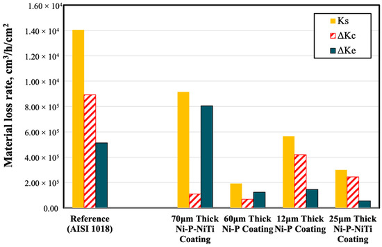 Figure 9 shows the material loss rates for the AISI 1018 steel substrate, the monolithic Ni-P coatings, and the composite Ni-P-NiTi coatings. The material loss rates are for erosion–corrosion (Kec), erosion only (Keo), corrosion only (Kco), and total synergy (Ks). As hypothesized, AISI 1018 had the highest material loss rates during erosion–corrosion, pure erosion, and pure corrosion while the Ni-P coatings had the lowest material loss rates. The 12 μm thick Ni-P coating had the highest erosion–corrosion and pure erosion resistance, however, the 60 μm thick Ni-P coating had the highest corrosion resistance.