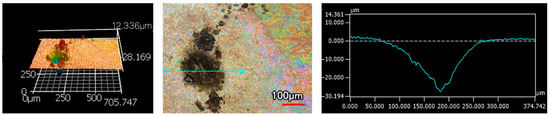 During erosion–corrosion, the formation of the passive layer is greatly affected by the surface roughness introduced by erosion. The impact energy of the particles is absorbed, and the surface is deformed plastically. Plastic deformation from erosion is evident on the coating’s surface. Figure 12 and Figure 13 show the micrographs and 3D imaging of the 70 μm thick Ni-P-NiTi surface after pure erosion. The micrographs show the uneven surface, and the material displacement is quantified by the 3D images. Figure 12 shows the formation of a crater, where the particle impact presses the coating material outward to create a cavity and displaces it to form a hill. The rough edges of the crater are noteworthy, as it shows how the material was deformed. Figure 13 shows a similar crater. However, the hill has been broken off due to repeated particle impact.