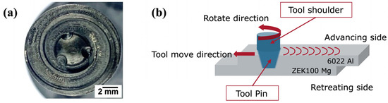 FSW has successfully been demonstrated in the solid–state joining process as one of the mechanical interlocking methods that can be applied to sample boundaries during the welding process [2]. The FSW process is based on the heat produced by plunging the rotating weld tool with a particular force into the materials to soften and form a plastically deformed zone and cause the fabrics to flow. This relatively low heat involved during joining can reduce the probability of residual stress, intermetallic layers, chemical reactions, and distortions between welded materials [10,12]. These factors make it a preferred welding process compared to fusion welding. According to the published papers, FSW has been extensively applied for welding Al and Mg alloys to investigate the effect of welding tools, travel speed, lap configuration, etc., on the formation of intermetallic compounds (IMCs) [8,10,13,14,15,16].