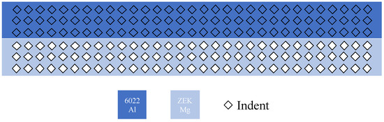 Microindentation: The Buehler Wilson VH3300, an automatic Vickers/Knoop hardness tester, was used to find the hardness distribution on the cross-section surface of the Al-Mg welds. As shown in Figure 2, the specimen has 6022 Al on top and ZEK100 Mg at the bottom. Each side has three rows and 31 columns of indents, and the averaged data of each of the three rows will be taken to ensure reliability. The various hardness values were applied in MATLAB to divide each region of the FSW zone. The indent spacing was 0.4 mm vertically and 0.8 mm horizontally. In this experiment, a Vickers indent with HV 0.3 was applied.