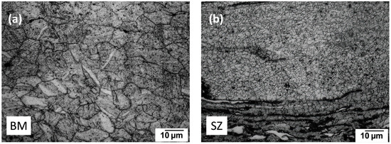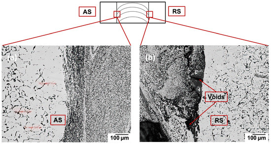 It is known that different welding parameters in the FSW process will have a significant effect on the phase types and distributions [21,22]. In this work, the grain size, structures, and intermetallic compounds (IMCs) from FSW under the selected welding conditions were characterized. The etched Al-Mg welded specimen, observed from diverse views, shows that the grain structure and size are very different at various locations. Figure 3 shows the optical microscopic (OM) pictures of etched 6022 Al from the top view, where Figure 3a is the advancing side with the same direction of welding and tool rotation. Figure 3b shows the retreating side with the opposite welding direction and tool rotation. Moreover, because of this difference, it can be observed that the advancing side has a better and smoother connection zone between the welding area and base Al, whereas the retreating side contains more voids and bonding gaps compared to the advancing side [23].