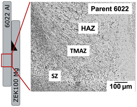 Figure 4 shows the grain size and structure at the cross-sectional view of the friction-stir welded 6022 Al alloy, Figure 5a under higher magnification; we could observe clearly that stirred zone (SZ) has the hardened precipitates dissolved, and the most significant amount of dynamic recrystallization process resulted from the high strain and thermal energies [24]. The surrounding thermomechanically affected zone (TMAZ) (Figure 5b) has a highly elongated grain structure caused by FSW-induced strains. In comparison, the heat-affected zone (HAZ) in Figure 5c refers to the region where the grains only experience thermally mediated recrystallization and grain refinement and, therefore, no mechanically plastic deformation [25]. In this case, we can observe the lower density of precipitates in SZ, TMAZ, and HAZ compared to base Al (Figure 5d) during the recrystallization process. The bottom of the ZEK100 Mg alloy also shows a similar grain distribution in that the center stirred region (Figure 6b) has a very clearly reduced grain size (~1 mm) while the surrounding base Mg (Figure 6a) has no evident FSW influence showing its original heterogeneous grain structure.