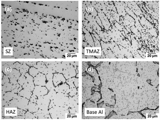 Optical microscopic pictures of a grain structure on etched 6022 Al from a cross-sectional perspective: (a) Stirred zone; (b) thermomechanically affected zone; (c) heat-affected zone; (d) base 6022 Al.