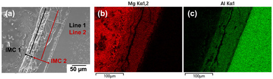 (a) SEM-SE image of diffusion bonded 6022 Al and ZEK100 Mg; (b) Mg and (c) Al are the respective EDS mapping of (a), which shows two intermetallic layers.