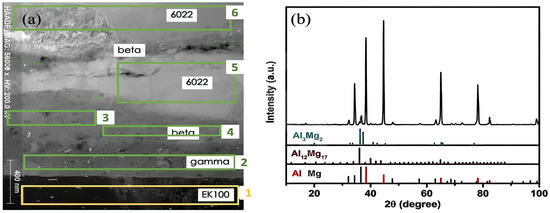 (a) STEM ZC micrograph of the interfacial layer between FSW 6022 Al and ZEK100 Mg; (b) XRD analysis that shows evidence of IMCs.