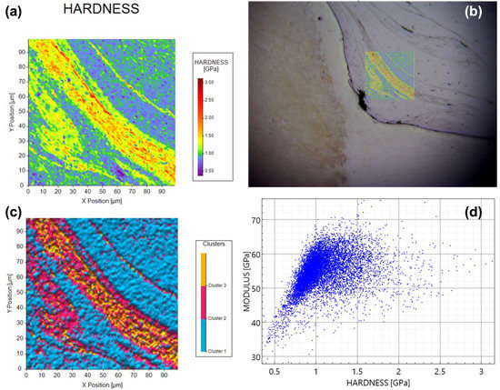 (a) Nanomechanical property map or contour plot wherein the range of values obtained are visually depicted using a color-coded legend for hardness values. (b) Imposition of (a) onto the region tested to obtain (a,c,d). (c) K-means clustering analyzed and replotted form of (a), wherein three centroids were assumed. (d) Modulus vs. hardness for each of the 10,000 data points underwriting the nanomechanical mapping-based analysis presented.