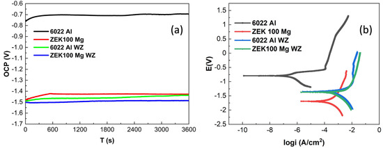(a) OCP plots (vs. Ag/AgCl) for 6022 Al and ZEK100 Mg and their weld zone (WZ), respectively; (b) potentiodynamic plots on 6022 Al ZEK100 Mg and their welding zone, respectively.