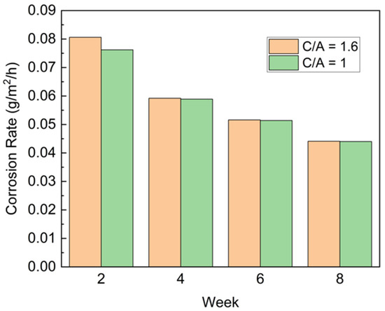 Figure 11 represents the weight loss rate for two groups of FSW samples with two different cathode-to-anode area ratios, tested for eight weeks. The results showed that at the initial two weeks, a larger cathode area was associated with a slightly higher corrosion rate than a smaller cathode area. This result matches the reported conclusion of the area effect in galvanic corrosion: For a given bimetallic corrosion system, a larger cathode or smaller anode means having a higher current density on the anode and, therefore, a greater corrosion rate [35]. However, after two weeks, the area effect gradually reduced because of the passivation behavior of aluminum alloy, which eliminates the cathodic area effect. It is found that at the initial corrosion stage there will form a thin Mg (OH)2 film [36] based on Equations (2)–(4) during corrosion. However, when Cl- exists, this film is quickly attacked and penetrated by Cl ions and then forms a porous structure, as shown in Figure 12a (corroded for one week in the corrosion chamber). The initial pitting corrosion was usually caused by aggressive anions corresponding to a critical potential where the adsorption capacity of chloride ions is stronger than that of oxygen atoms or water molecules [37,38]. Moreover, the aggressive anions can propagate into the tiny pores, making the breakdown potential even more negative.