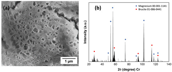 With continued corrosion under cyclic conditions, the film can thicken, and cracks will appear. Within the cracks, water vapor condenses, and corrosive gases will be absorbed. These cracks provide a diffusion path for corrosive ions into the matrix, forming severe local corrosion at the early stage. Another result that can be observed from Figure 11 is the gradually decreased corrosion rate occurs biweekly. Magnesium corrosion products, for example, brucite from Equation (4) and XRD result in Figure 12b, are likely to have a repassivation effect, which could decelerate the corrosion rate before the film was attacked by the aggressive ions.