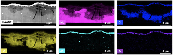 STEM/EDS of the FIB lamella and corresponding X-ray maps displaying the spatial location of Mg, Cl, O, Zn, and Zr in the corrosion product of ZEK100 Mg.