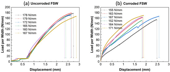 Load-displacement curves of the FSW specimen: (a) Uncorroded; (b) corroded after eight weeks.