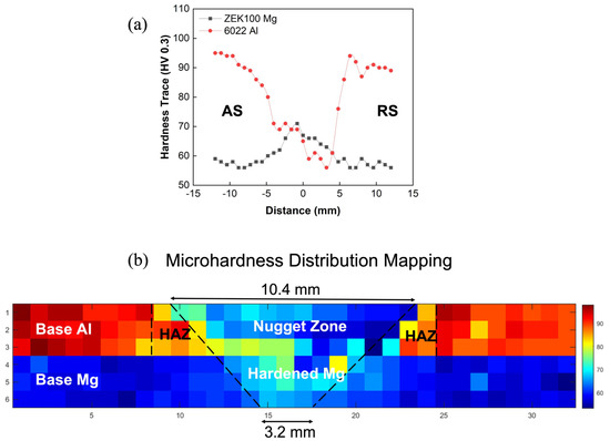 The 6022 Al sample as a precipitation-hardened aluminum alloy [39] on the top showed a softened zone around the weld center, and it can be suggested that its hardness profile strongly depends on the hardened precipitation distribution instead of grain size. This softening effect in the central weld zone is caused by the dissolution and coarsening of the number of hardened precipitations [22]. By contrast, the bottom ZEK100 Mg sheet is not to be significantly affected by mechanical softening and dynamic recrystallization. Thus, it will rely more on the intermetallic layers and the grain size distribution according to the Hall–Petch relationship. As Figure 6 shows, the gradual reduction in grain size, therefore, the increased micro-hardness value from base metal to weld zone are shown in Figure 16a. Another finding from this plot is that the advancing side shown in Figure 16a appears to have a higher hardness value than the retreating side, especially on 6022 Al; this can also be observed in Figure 3, where the advancing side has a better and smoother weld connection as compared with the retreating side and where there is less continuous bonding, lack of material consolidation, and clear pores and voids.
