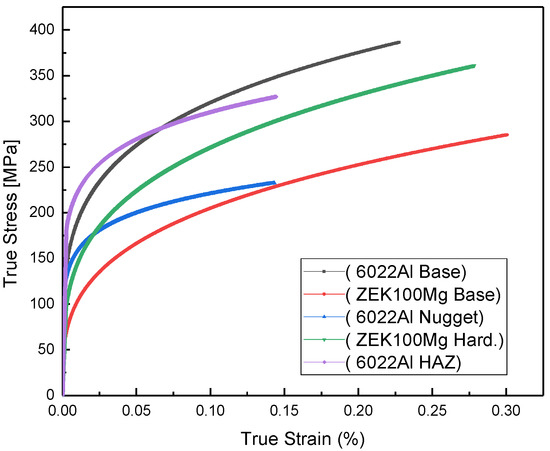 Based on the approximate division of each zone from Figure 16b, the true stress–strain curves measured by a flat-punch instrumented strength and plasticity microprobe testing technique on each region of the FSW specimen give a similar tendency compared to their hardness values. Compared to the base Al, Al nuggets and Al HAZ exhibit lower strength because of the mechanical and thermal effects. While for magnesium, the surrounding hardened Mg region exhibits higher stress than that of the base Mg, as shown in Figure 17. These two mechanical results both indicate that for top sheet 6022 Al, the welding power and thermal effect could cause a decreased mechanical behavior. Whereas for the bottom ZEK Mg, the thermal effect could optimize the grain structure, and recrystallization could also help improve its mechanical properties.