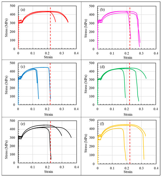 Triplicate stress–strain plots for various charging times and delay between end of charging and start of tensile testing: (a) control/non-charged, (b) 6 h charge, 30 min delay, (c) 24 h charge, 30 min delay, (d) 24 h charge, 7-day delay, (e) 24 h charge, 14-day delay, (f) 24 h charge, 28-day delay. Red-dotted line represents the specified 22% minimum elongation (strain) for grade 250 mild steel.