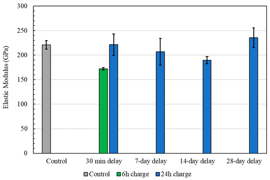 Average elastic modulus, including standard error bars, of identical triplicate dog-bone test specimens subjected to various charging and delay to testing times. Non-charged control specimens also shown for comparison.