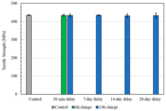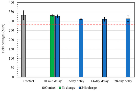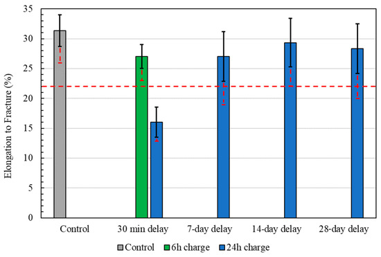 It is most relevant to consider the worst case or value in any given data set. Meaning, the sample with highest loss of elongation can be taken as the design consideration of the set and must meet the standard requirement for this grade (22%) for all samples within the exposure condition to meet the grade. For the control specimens, the individual sample with the lowest elongation (26%) met the standard requirement. However, as per Figure 4, considering the blue (24 h charge, 30 min delay), green (24 h charge, 7-day delay), and yellow (24 h charge, 28-day delay) data sets, the worst-case specimens fell below the acceptable limit of elongation (13%, 19%, and 20%, respectively), even though the average elongation (16%, 27%, and 28%, respectively) passed the standard requirement for the 24 h, 7-day delay and the 24 h, 28-day delay cases. Therefore, in each of these cases, the entire set does not meet the standard and cannot be accepted for use. On the other hand, for the 24 h charge, 14-day delay case, all three individual elongation values (30%, 22%, 36%) met the standard requirement, albeit only just matching the criteria for acceptability. In this case, we expect it to be very likely that if more specimens were tested there would be a high probability of one of those specimens failing to reach the minimum criteria; particularly since the 24 h charge, 28-day data set failed the meet this criteria, and there is assumed to be an overall equivalent or higher degree of ductility recovery for the 28-day delay than for the 14-day delay. Therefore, we suggest that, given the large variability between identical specimens, a larger number of replicates should be considered in further work on this matter to fully understand the expected variability within large batches of material.