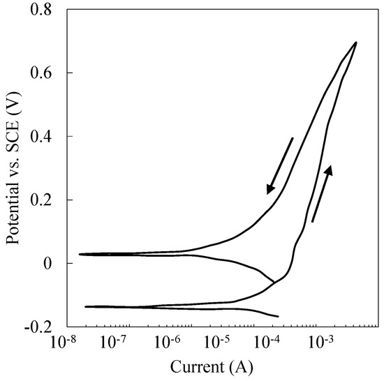 A cyclic potentiodynamic polarization curve of the specimens tested in PBS solution at 37 °C and immersed for 24 h is shown in Figure 1. The whole curve depicts characteristics of passive behavior in the test environment. Up to +0.7 V vs. SCE potential excursion, there is no evidence of an active–passive transition related to the initiation of localized corrosion processes. Negative hysteresis at reverse potential scan confirms the stability and resistance to passive film breakdown [69,70,71].