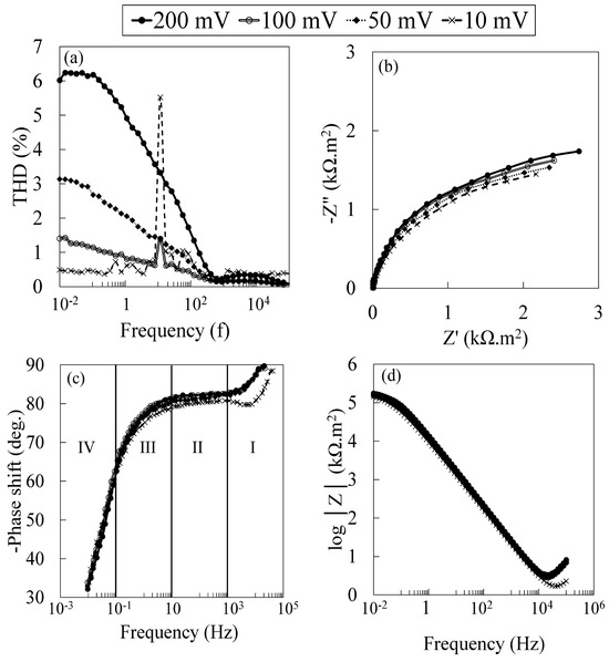 Looking at total harmonic distortions obtained with different perturbation potentials, it is evident that increasing stimulus potential results in a nonlinear polarization response from the surface, especially at lower frequencies. In Figure 2b, it appears that increasing the stimulus potential decreased all the impedances of the system. In the high order of the harmonic potential, the interface layer capacitance (Cdl) and charge transfer (Rct) response of the surface may yield nonlinear behavior to AC perturbation, and as a result, AC can potentially induce further dissolution [55,57,73]. As demonstrated in Figure 2b, a decrease in system impedances is observed by increasing potential perturbation in the whole spectrum. At high frequencies, the current is absorbed mainly by the interface capacitance, and the contribution of the nonlinear resistance of the charge transfer was negligible. However, by decreasing the frequency, the current flowed progressively through the nonlinear charge transfer resistor, increasing the nonlinearity at low frequencies [66]. In addition to the nonlinear behavior of the charge transfer resistance against high-order potential perturbations, as shown in Figure 2a, faradaic distortion can affect the capacitive behavior at the electrolyte/oxide film/substrate [74,75,76].