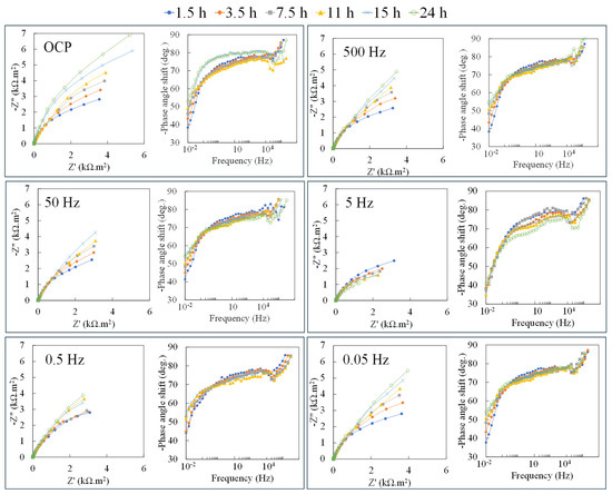 The effect of low potential excitation with different frequencies was investigated on the specimens after 24 h of immersion in the 1X-PBS electrolyte. The amplitude of 100 mV was chosen as the potential excitation, as it typically exists in the human body, tissue, and implant material [89]. For each condition, after preparation, the specimens were exposed to the 1X-PBS solution for 1 h at their OCP. Then, 100 mV sinusoidal potential vs. their OCP was applied to the specimens with constant frequency for 24 h. Here, 500, 50, 0.5, and 0.05 Hz were chosen as the frequencies. These frequencies were selected to represent one frequency in each section in Figure 2c. The application of the alternating potential was stopped for approximately 10 min, and standard/linear EIS (±10 mV perturbation at corresponding OCP, with a frequency range of 100 kHz to 1 mHz) was conducted on the specimens. Figure 3 shows the typical Nyquist and Bode phase (φadj) obtained from EIS measurements during 24 h exposure under different sinusoidal frequency perturbations.