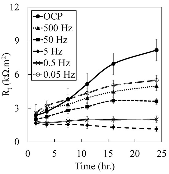 In all measurements, a single depressed arc can be observed in the Nyquist plot, indicating that electrochemical reactions in all examined conditions were governed by charge transfer control. This characteristic is also evident in Bode phase plots, where no distinct local minima in the medium to low frequency were observed. The non-steady phase angles at frequencies above 103 Hz mainly arise from surface geometry inducing an even potential. In the specimen at OCP, the impedance consistently rises upon immersion time, with the phase angles stabilizing at higher angles. However, this trend cannot be observed in other specimens exposed to frequent oxidation and reduction at different frequencies. To better understand the change and trend of the electrochemical behavior of the examined specimens, the specimens’ charge transfer resistances, i.e., Rt, were then obtained from the results of the EIS tests using the Brug method [90], presented in Figure 4.