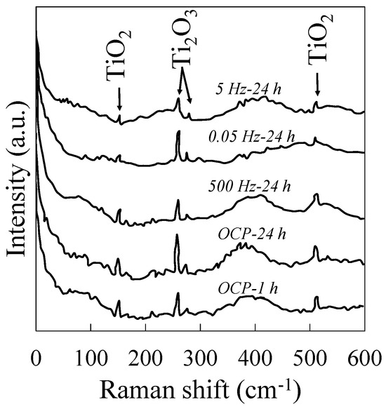 The chemical composition of the Ti oxide film formed on the specimens is expected to be transformed or indiscernible when using the ex situ examination methods [4,67]. Thus, in situ Raman spectroscopy was used to study and compare the formation and transformation of the oxide crystal modifications as a function of electrochemical parameters [10,68]. The films formed on the surface of the specimens after 24 h of immersion in the PBS solution at 37 °C at their OCP, and were investigated when they were perturbed with 100 mV sinusoidal potential vs. OCP with different frequencies. The Raman spectra obtained were corrected for the electrolyte background. The necessity of this correction was discussed elsewhere [68].