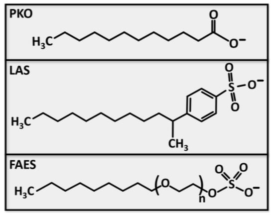 Structural formula of the anionic surfactants palm kernel oil (PKO), linear alkylbenzene sulfonate (LAS) and fatty alcohol ether sulfate (FAES).